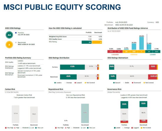 ESG (environmental, social and governance) Investing is a term that is often used synonymously with sustainable investing, socially responsible investing, mission-related investing, or screening. It's the consideration of environmental, social and governance factors alongside financial factors in the investment decision-making process which can help identify material risks and growth opportunities. ESG metrics are not commonly part of mandatory financial reporting, though companies are increasingly making disclosures in their annual report or in a standalone sustainability report. AJL has integrated ESG criteria across our entire portfolio and the snapshot shows how AJL's portfolio stacks up when evaluated based on ESG factors (as of 9/30/2025).